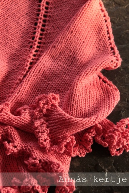 I finished today a little scarf (or shawl) to my daughter. I chose Barka Gilice Hajnal cottonyarn for this project and 2 skeins was enough. I knitted a whole scarf with stocking stitch rows and I crocheted its edge with a little ruffle from fivechain-laces. The lenght of the scarf is 110 cm and by centre back is 45 cm.