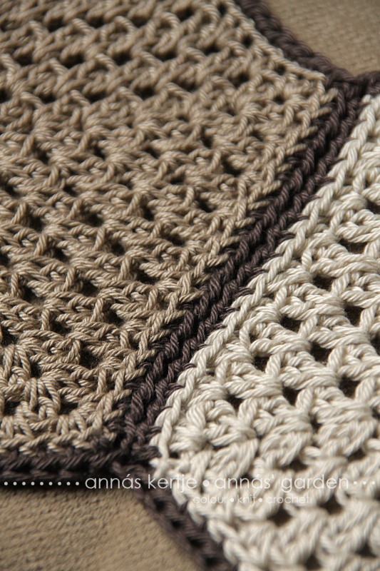 ... és így a színéről. Nagyon szeretem a nagyimintát, de ha hagyományosan, csakis egyráhajtásos pálcákkal dolgoztam volna, akkor az összehorgolásnál nem marad meg a hatszög széle viszonylag egyenesnek, hanem az összehorgoló kör "beleharapott" volna a kontúrokba. Ezért kellett a félpálcás 9. kör, mert a félpálcák viccesek, a tetejükön nem kettő, hanem három szál van. Ha a két hátsóba öltve horgolom össze őket, akkor az elöl maradó egy szál megadja azt a körvonalat, amire szükségem volt ahhoz, hogy a hatszögek a lehető leghatszögebbek maradjanak. Így is pitykés egy kicsit, de nem zavaróan.
