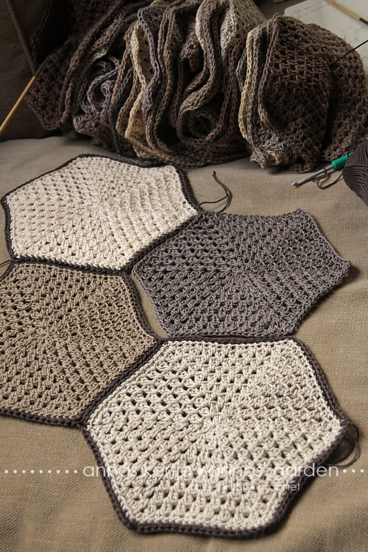 A hatszögek mintarajza alapján átlagos pamutfonalból (120-125 m/50 g) 4 mm-es tűvel meghorgoltam a 37 hatszöget, majd eldolgoztam a fonalvégeket is, hogy ne a legvégére maradjon ez a végtelenül sziszifuszi munka.
