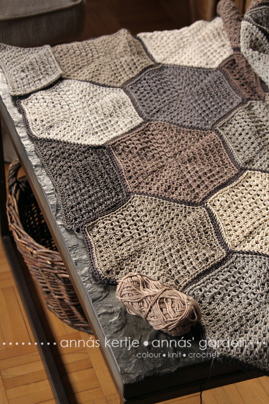 Egész hamar körbe lehet érni a takarón, bár még mindig nem vagyok készen, mert el kell dolgozni a fonalvégeket és kap némi szegélyt is a hatszögblokkos takaró. Csak azt még ki kell találnom :)